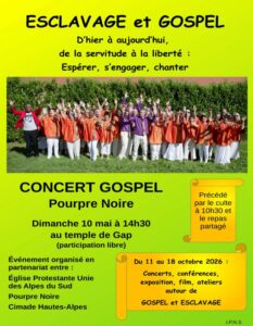 POURPRE NOIRE, seul choeur de Gospel du sud des Alpes, a été créé en juin 2010 par 14 « fanas » de GOSPEL, souhaitant chanter des Slave Songs, Spirituals et Gospels et présenter au public ces chants qui trouvent leur fondement dans la lutte des esclaves noirs déracinés de leur Afrique natale, dans le combat pour l’abolition de l’esclavage et contre la ségrégation de ces hommes et de leurs descendants.